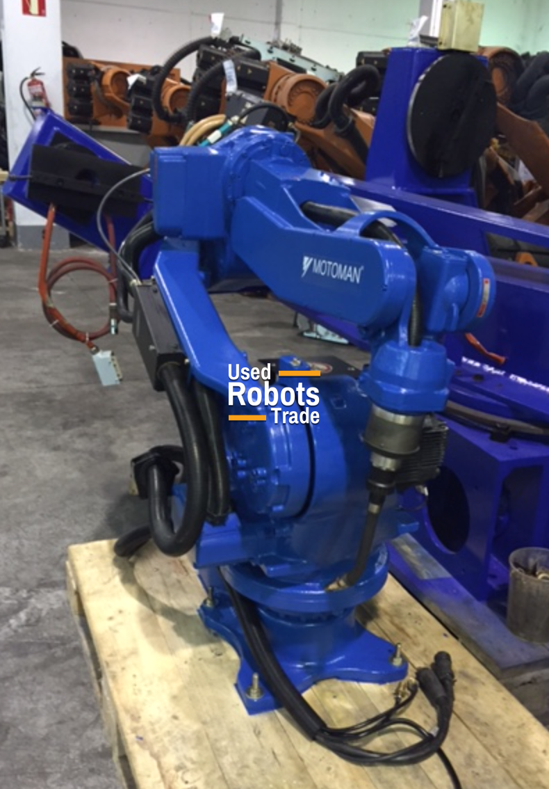 Motoman EA1800N is Special design six axis arc welding robot featuring 1806 mm horizontal arm reach. The robot is unique because the complete media hose package is also lead through by the upper arm and the head axes of the robot which reduces obstructions and results in an expansion of the usable working range. Equipped with the Yaskawa Motoman NX100 controller.